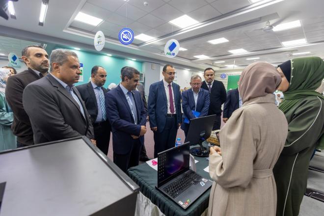 وانطلقت احتفالية الافتتاح بحضور ومشاركة كل من م. سهيل مدوخ وكيل وزارة الاتصالات وتكنولوجيا المعلومات ووفد من الوزارة و د. سعيد الزبدة رئيس الكلية، و م. أسامة غانم رئيس قسم تكنولوجيا المعلومات، وممثلين عن المؤسسات والشركات التقنية والأكاديميين وطلبة الاتصالات وتكنولوجيا المعلومات وطالبات الثانوية.